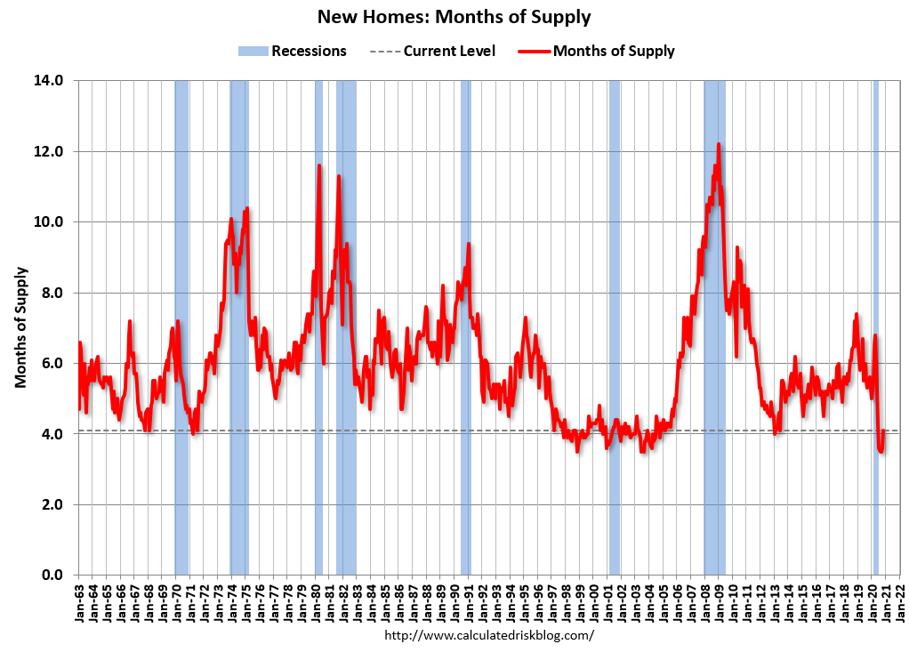 The all time record high was 12.1 months of supply in January 2009. The all time record low is 3.5 months, most recently in September 2020.