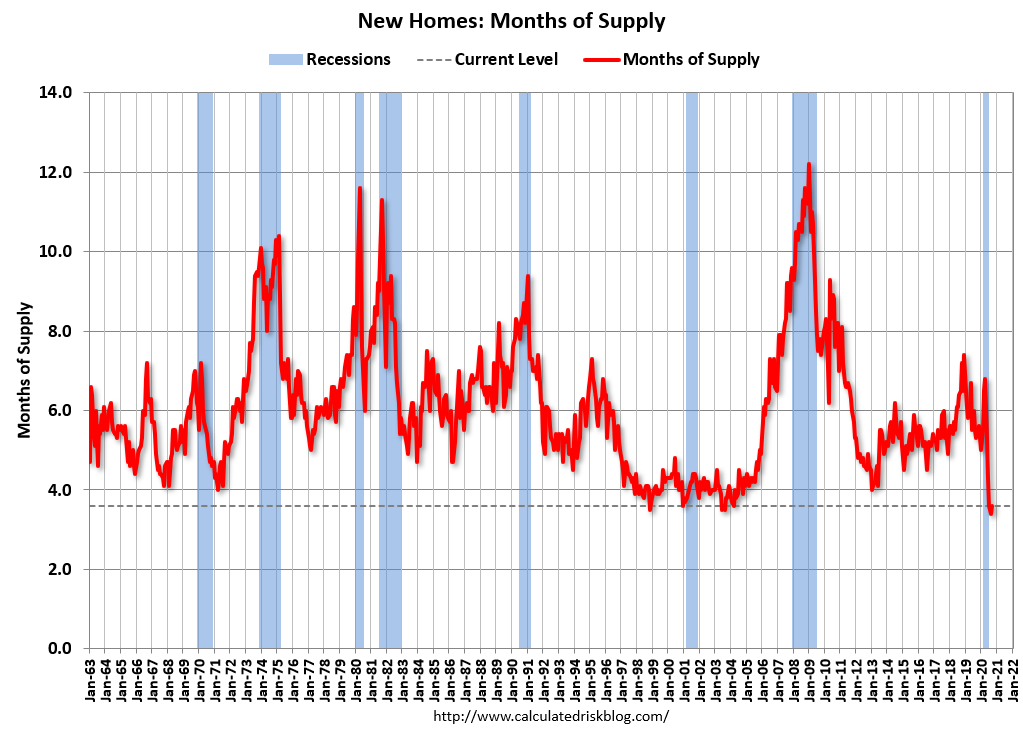 The all time record high was 12.1 months of supply in January 2009. The all time record low was 3.4 months in August 2020.
