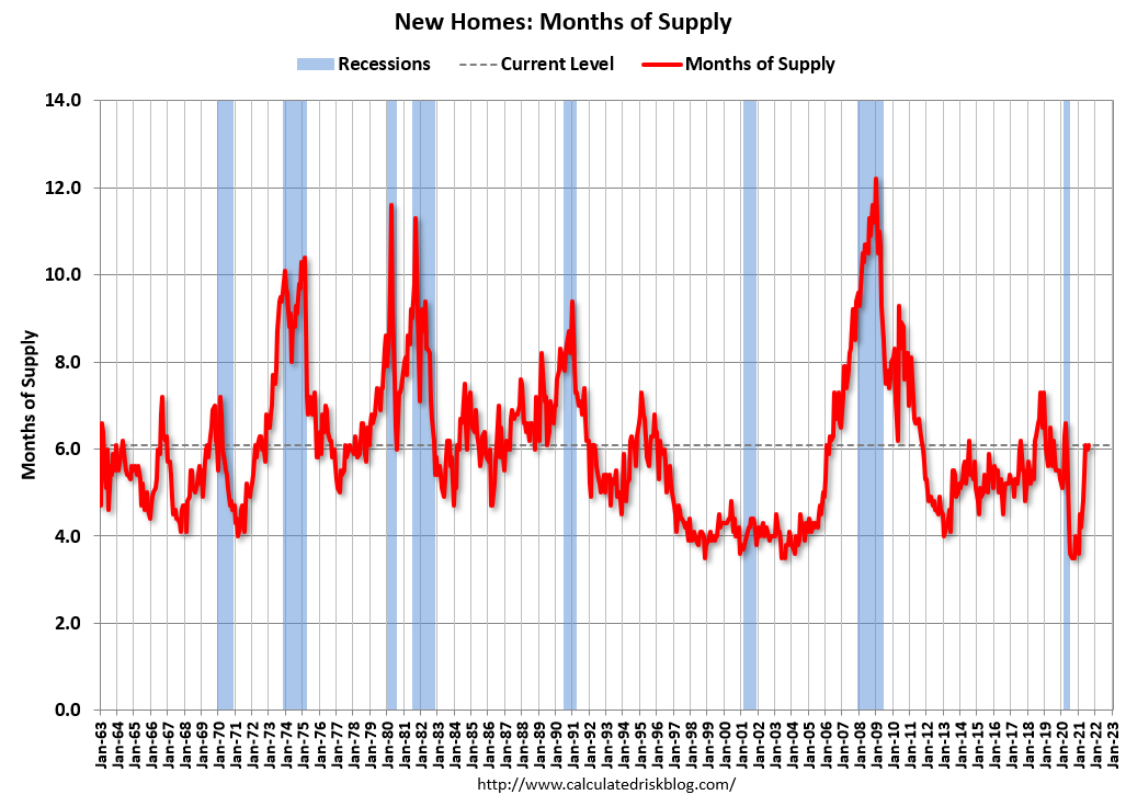 The all time record high was 12.1 months of supply in January 2009. The all time record low was 3.5 months, most recently in October 2020.
