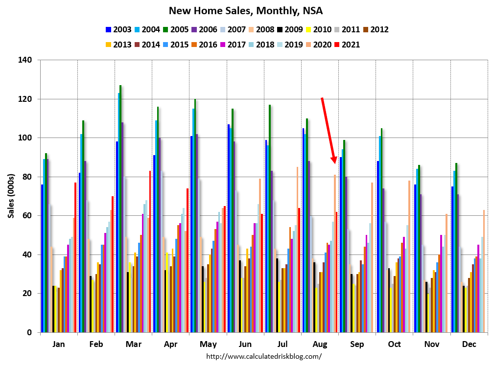 In August 2021 (red column), 62 thousand new homes were sold (NSA). Last year, 81 thousand homes were sold in August.