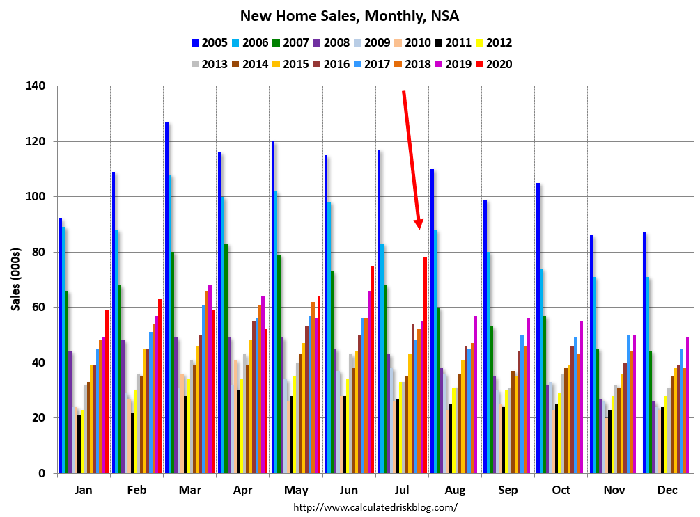 In July 2020 (red column), 78 thousand new homes were sold (NSA). Last year, 55 thousand homes were sold in July.
