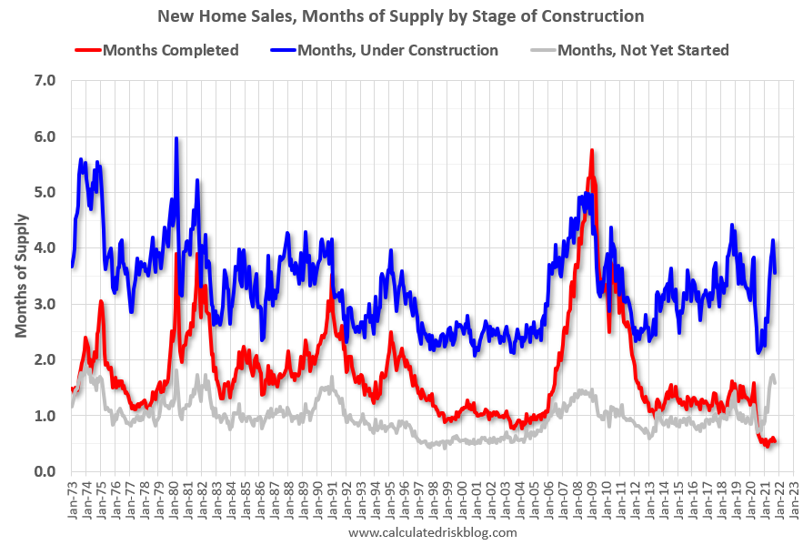 The inventory of completed homes for sale was at 36 thousand in September, just above the record low of 33 thousand in March, April, May and July 2021. That is about 0.5 months of completed supply (just above the record low).