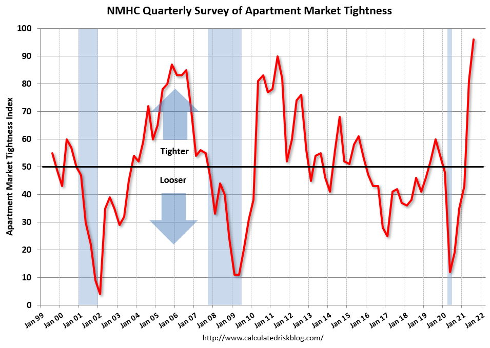 “Nearly all (92 percent) respondents this quarter observed tighter conditions in their apartment markets, signaling that the worst of the pandemic could be behind us. Apartment sales volume is strong as well, bolstered by continued low interest rates and strong availability of equity financing.”