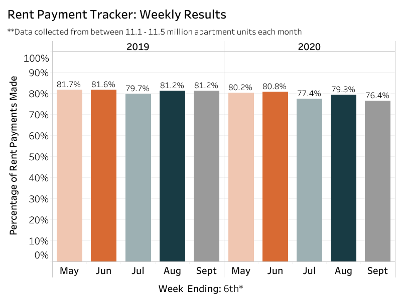“It is worth noting that the Labor Day weekend, which occurred a week later than in 2019, may have impacted the collections data for the first week of the month, just as our data showed a comparable dip the first week of July because of the Fourth of July holiday,” said Bibby. “Next week’s Rent Payment Tracker numbers will help indicate the degree to which the drop in payments was a result of the holiday weekend or decreased ability of residents to pay their rent.”