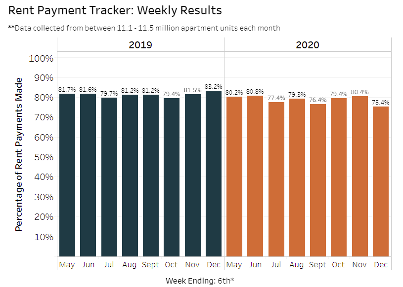 The National Multifamily Housing Council (NMHC)’s Rent Payment Tracker found 75.4 percent of apartment households made a full or partial rent payment by December 6 in its survey of 11.5 million units of professionally managed apartment units across the country.