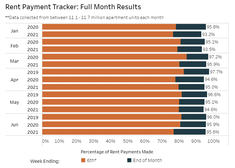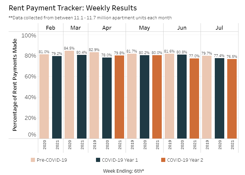 This is a 0.9 percentage point decrease from the share who paid rent through July 6, 2020 and compares to 79.7 percent that had been paid by July 6, 2019. This data encompasses a wide variety of market-rate rental properties across the United States, which can vary by size, type and average rental price.