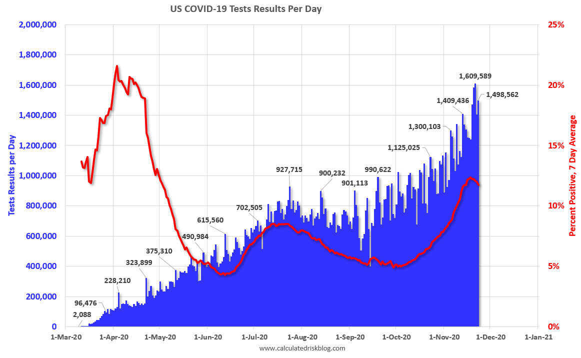 The US is now averaging over 1 million tests per day. Based on the experience of other countries, for adequate test-and-trace (and isolation) to reduce infections, the percent positive needs to be well under 5% (probably close to 1%), so the US still needs to increase the number of tests per day significantly (or take actions to push down the number of new infections).