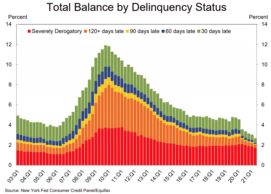 The Federal Reserve Bank of New York’s Center for Microeconomic Data today issued its Quarterly Report on Household Debt and Credit . The report shows that total household debt increased by $313 billion (2.1%) to $14.96 trillion in the second quarter of 2021. The total debt balance is now $812 billion higher than at the end of 2019. The 2.1% increase in aggregate balances was the largest seen since Q4 2013 and marked the largest nominal increase in debt balances since Q2 2007. The Report is based on data from the New York Fed’s Consumer Credit Panel, a nationally representative random sample of individual- and household-level debt and credit records drawn from anonymized Equifax credit data.