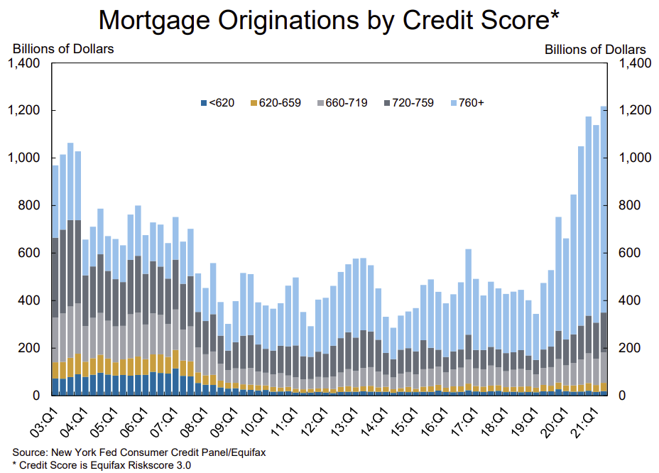 Median mortgage origination credit scores were roughly flat, with the median credit score of newly originated mortgages at 786, reflecting a continuing high quality of underwriting standards and higher shares of refinances. … There was $1.22 trillion in newly originated mortgage debt in 2021Q2, with 71% of it originated to borrowers with credit scores over 760.