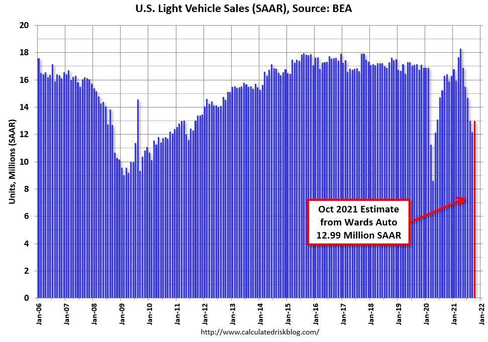 Wards Auto released their estimate of light vehicle sales for October. Wards Auto estimates sales of 12.99 million SAAR in October 2021 (Seasonally Adjusted Annual Rate), up 6.8% from the September sales rate, and down 20.8% from October 2020.