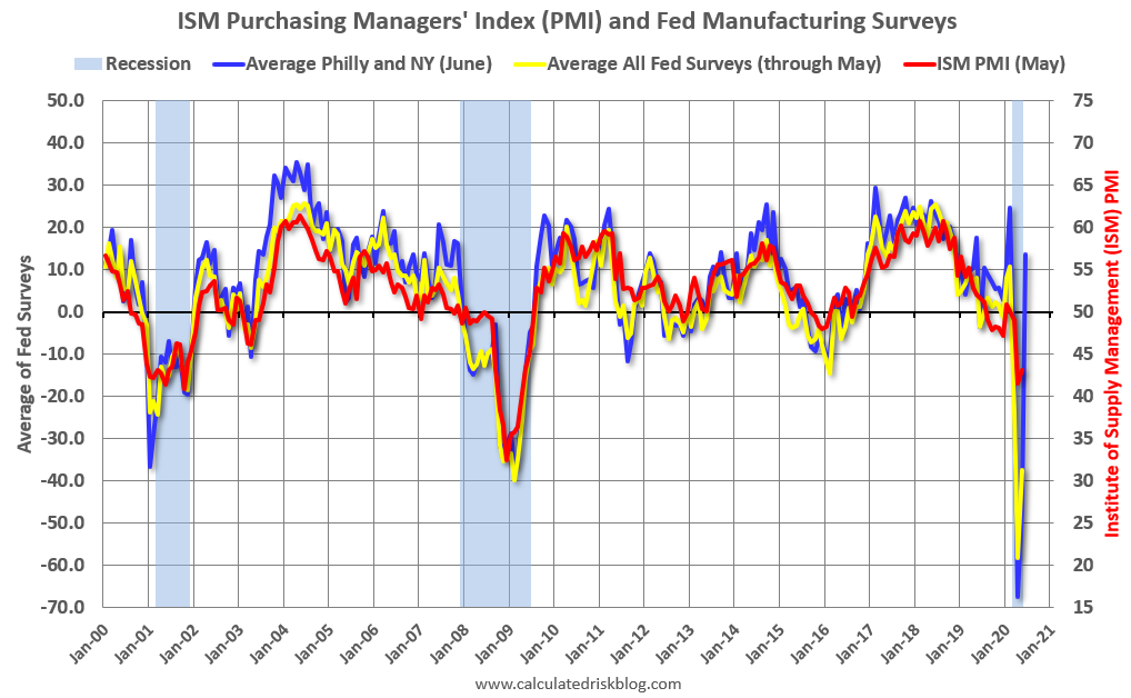 The New York and Philly Fed surveys are averaged together (yellow, through June), and five Fed surveys are averaged (blue, through May) including New York, Philly, Richmond, Dallas and Kansas City. The Institute for Supply Management (ISM) PMI (red) is through May (right axis).