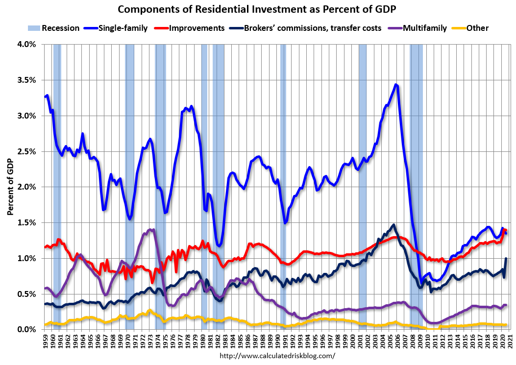 The second graph is for Residential investment components as a percent of GDP. According to the Bureau of Economic Analysis, RI includes new single family structures, multifamily structures, home improvement, Brokers’ commissions and other ownership transfer costs, and a few minor categories (dormitories, manufactured homes).