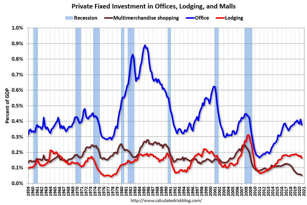 The first graph shows investment in offices, malls and lodging as a percent of GDP.