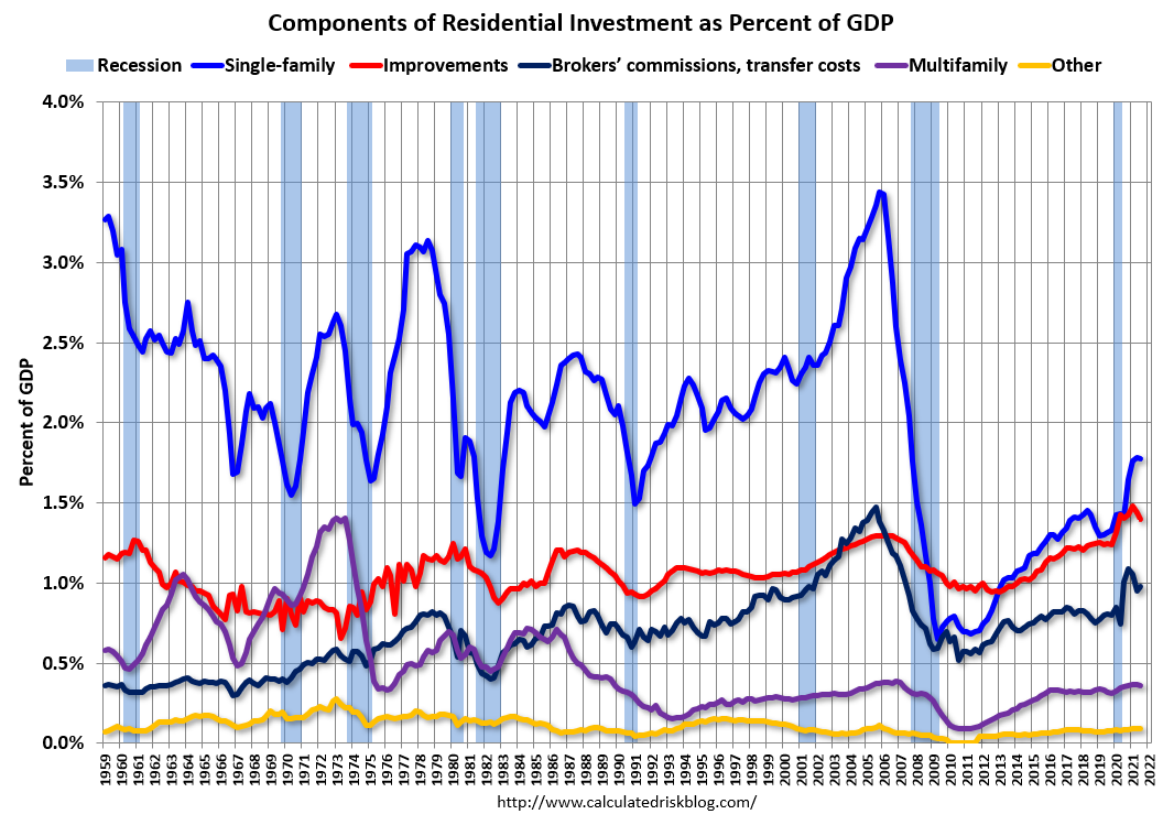 The second graph is for Residential investment components as a percent of GDP. According to the Bureau of Economic Analysis, RI includes new single family structures, multifamily structures, home improvement, Brokers’ commissions and other ownership transfer costs, and a few minor categories (dormitories, manufactured homes).