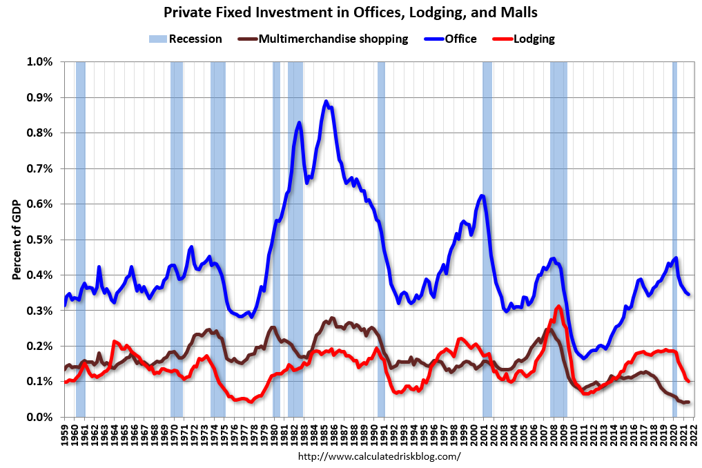 The first graph shows investment in offices, malls and lodging as a percent of GDP.