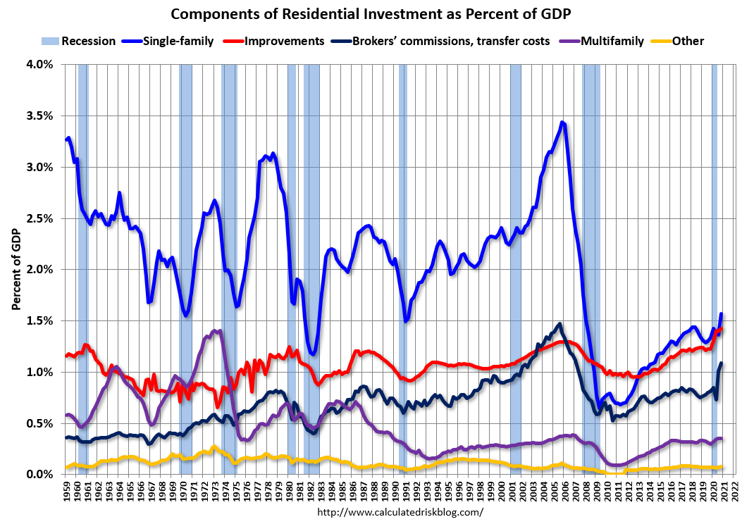 The second graph is for Residential investment components as a percent of GDP. According to the Bureau of Economic Analysis, RI includes new single family structures, multifamily structures, home improvement, Brokers’ commissions and other ownership transfer costs, and a few minor categories (dormitories, manufactured homes).