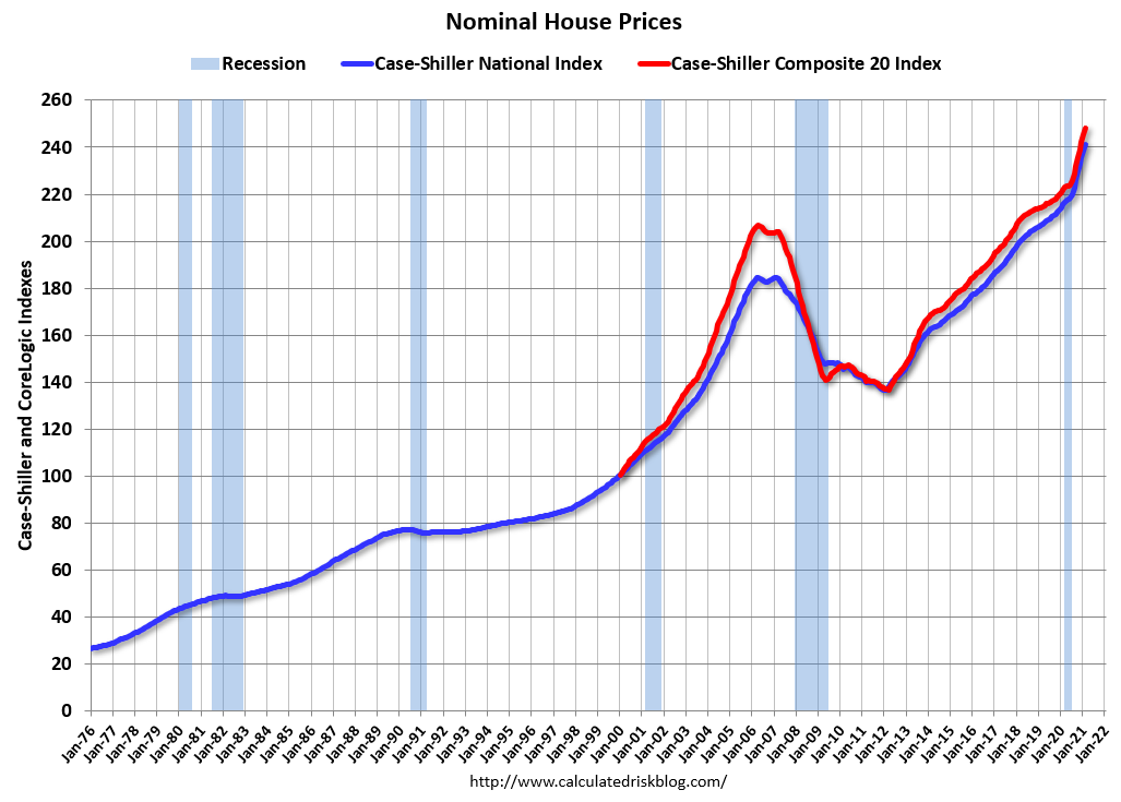In nominal terms, the Case-Shiller National index (SA) and the Case-Shiller Composite 20 Index (SA) are both at new all times highs (above the bubble peak).