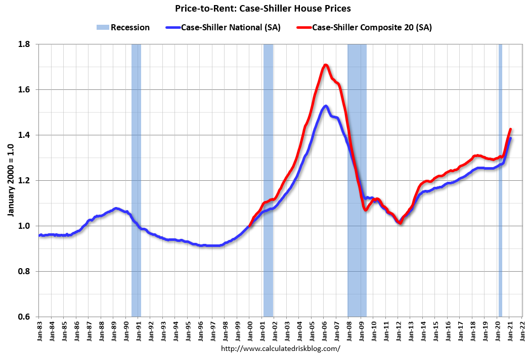 On a price-to-rent basis, the Case-Shiller National index is back to January 2005 levels, and the Composite 20 index is back to June 2004 levels.