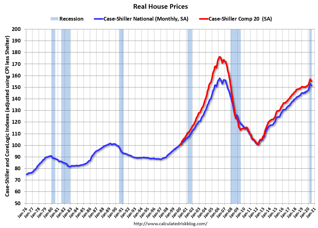 In nominal terms, the Case-Shiller National index (SA) and the Case-Shiller Composite 20 Index (SA) are both at new all times highs (above the bubble peak).