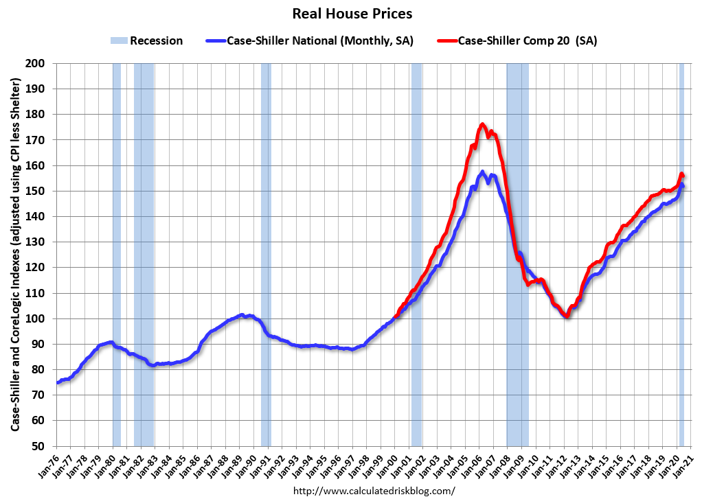 In nominal terms, the Case-Shiller National index (SA) and the Case-Shiller Composite 20 Index (SA) are both at new all times highs (above the bubble peak).