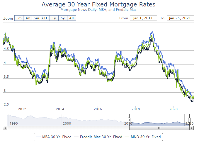 This graph is interactive, and you could view mortgage rates back to the mid-1980s – click here for interactive graph.