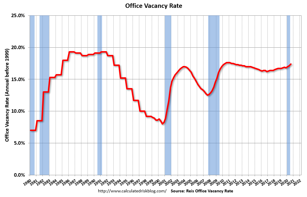 Reis reported the vacancy rate was at 17.4% in Q3, up from 17.1% in Q2, and up from 16.9% in Q3 2019. The office vacancy rate had been mostly moving sideways at an elevated level, but has increased over the last two years. And will likely increase further as leases expire.