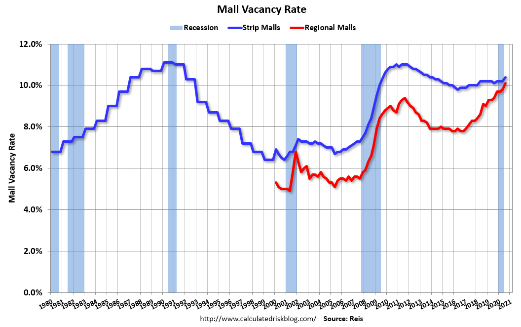 For Regional malls, the vacancy rate was 10.1% in Q3, up from 9.8% in Q2, and up from 9.4% in Q3 2019.