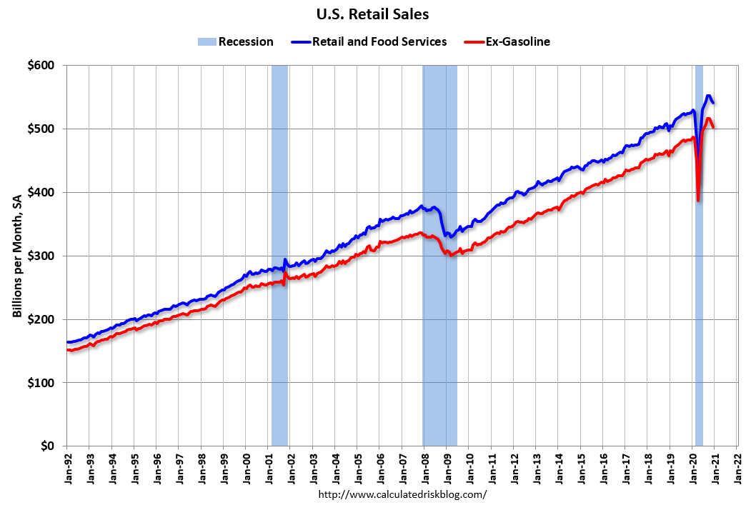 Advance estimates of U.S. retail and food services sales for December 2020, adjusted for seasonal variation and holiday and trading-day differences, but not for price changes, were $540.9 billion, a decrease of 0.7 percent from the previous month, but 2.9 percent above December 2019. Total sales for the 12 months of 2020 were up 0.6 percent from 2019. … The October 2020 to November 2020 percent change was revised from down 1.1 percent to down 1.4 percent.