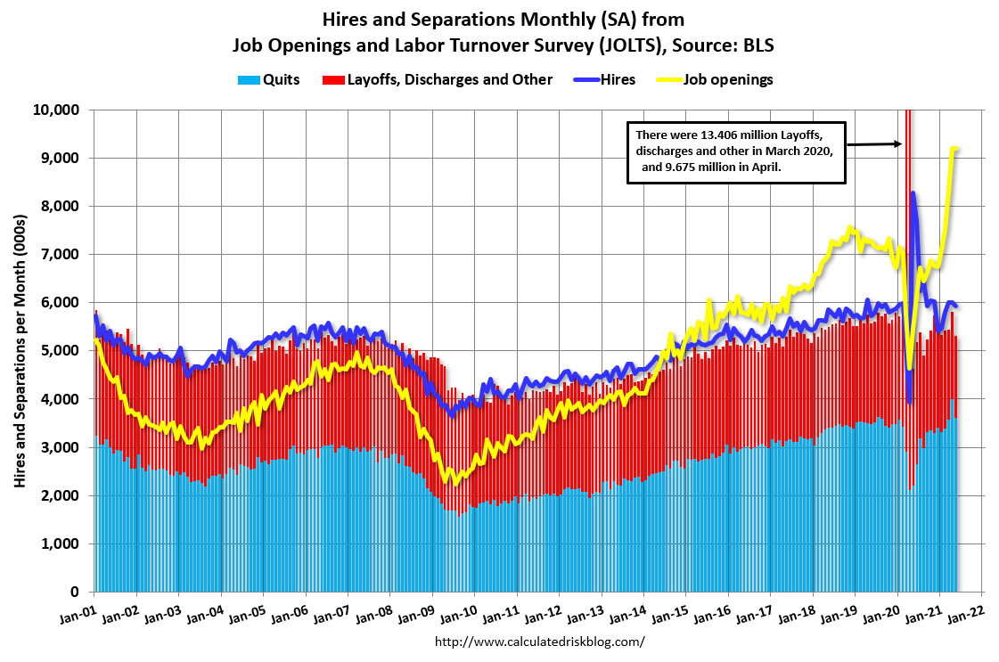 This graph shows job openings (yellow line), hires (purple), Layoff, Discharges and other (red column), and Quits (light blue column) from the JOLTS.