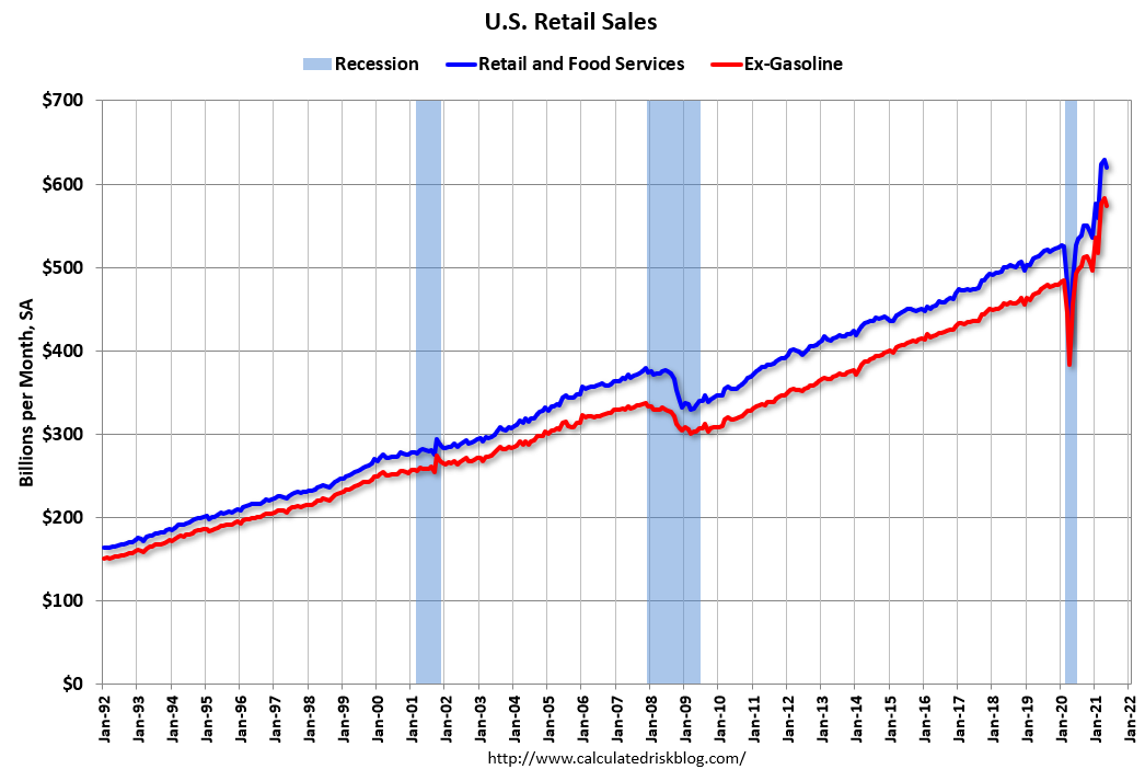 This graph shows retail sales since 1992. This is monthly retail sales and food service, seasonally adjusted (total and ex-gasoline).