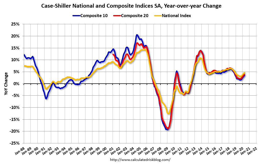 This graph shows the year-over-year change in the seasonally adjusted National Index, Composite 10 and Composite 20 indexes through the most recent report (the Composite 20 was started in January 2000).