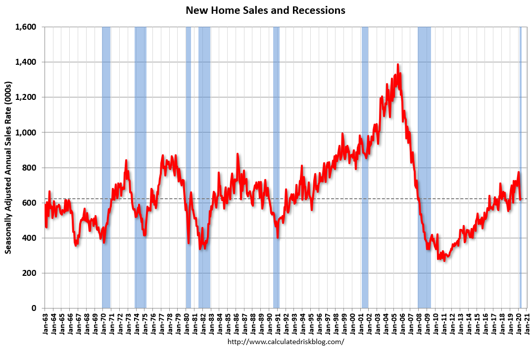 This graph shows New Home Sales since 1963. The dashed line is the sales rate for last month.