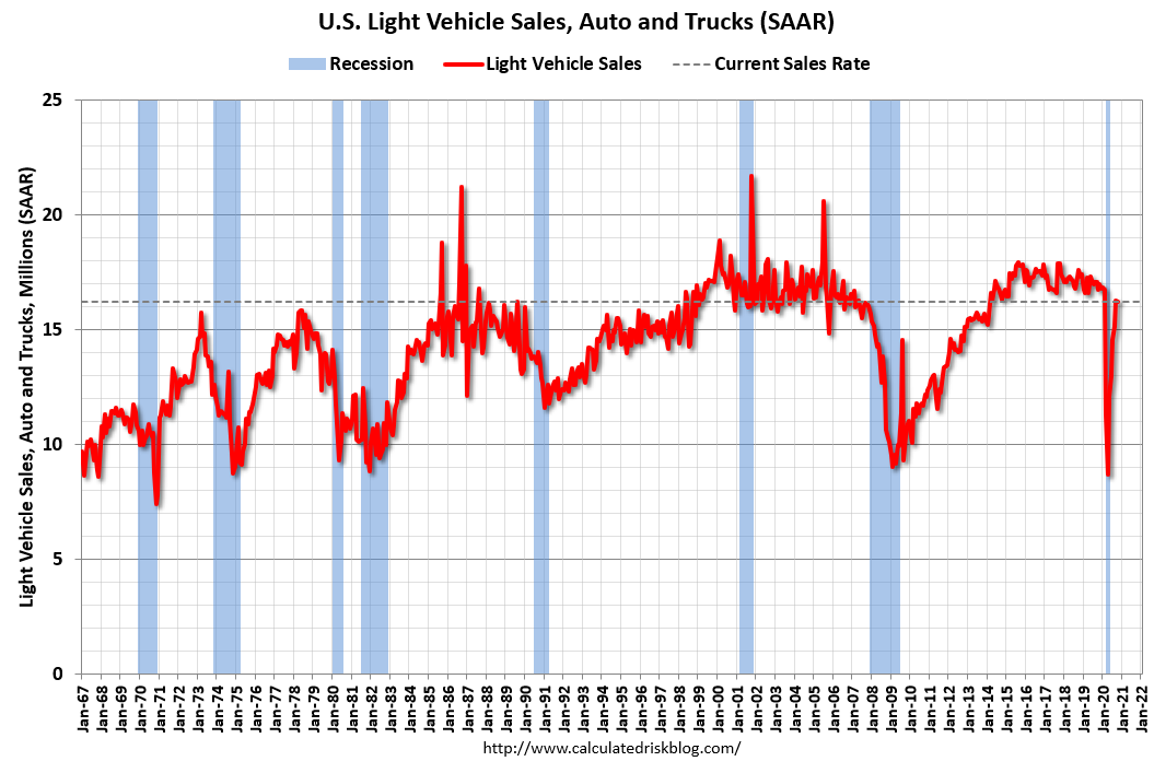 This graph shows light vehicle sales since the BEA started keeping data in 1967. The dashed line is the current sales rate.
