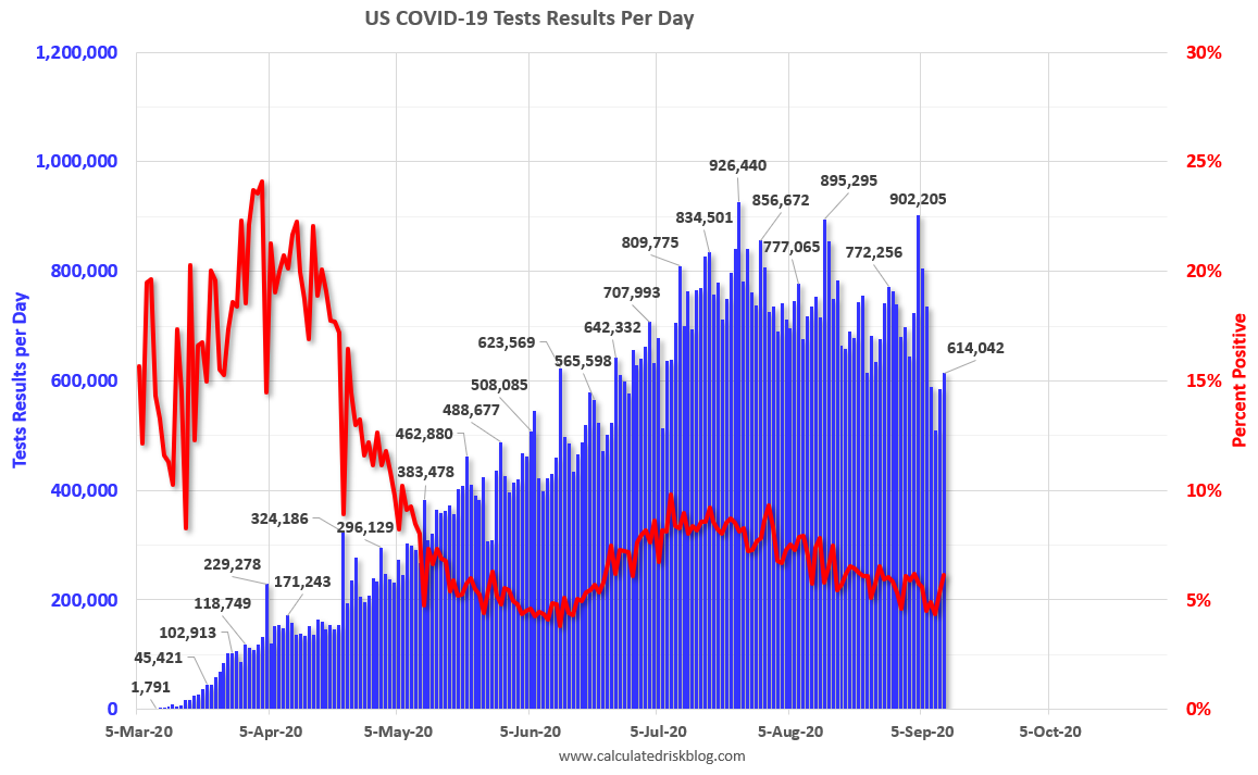 The US is now mostly reporting over 700,000 tests per day. Based on the experience of other countries, the percent positive needs to be well under 5% to really push down new infections, so the US still needs to increase the number of tests per day significantly (or take actions to push down the number of new infections).