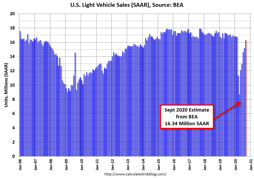 The BEA released their estimate of light vehicle sales for September this morning. The BEA estimates sales of 16.34 million SAAR in September 2020 (Seasonally Adjusted Annual Rate), up 7.6% from the August sales rate, and down 4.3% from September 2019.