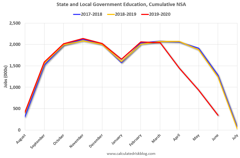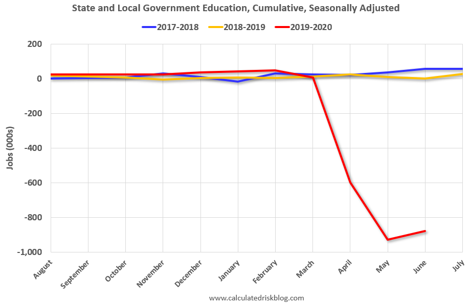 However, in the 2019-2020 school year, layoffs started much earlier. Now, in July, the red line will have to come back close to zero after the seasonal adjustment. This would suggest about 850 thousand jobs added in July SA.