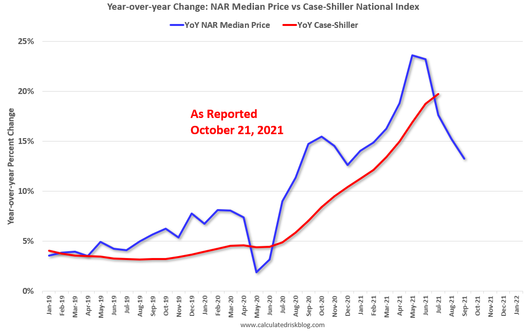 [This graph] – as of the NAR release yesterday – shows that Case-Shiller followed the median prices up, and that median prices are now falling.