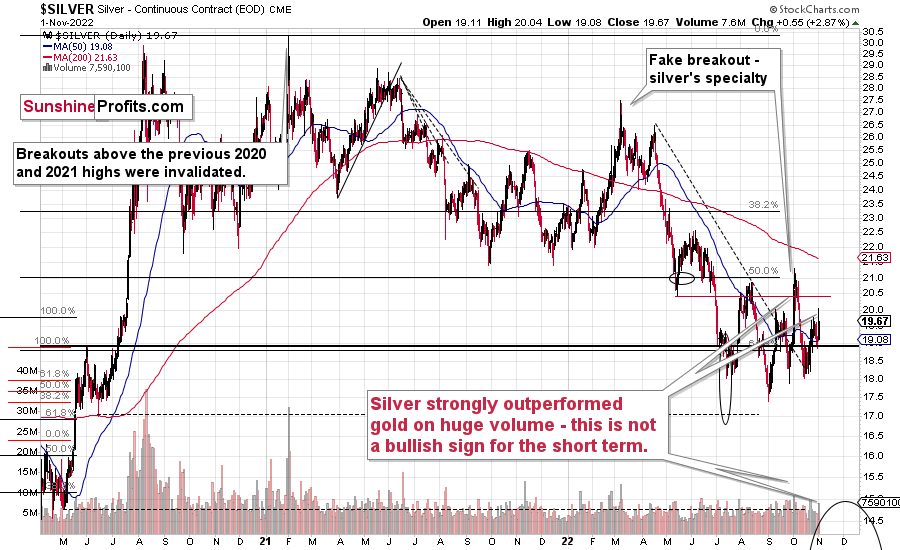 The signal comes from silver’s very short-term outperformance of gold. Whenever something like that happens (especially on strong volume) after a rally, it’s an indication that the rally is either over or about to be over. And yes, yesterday’s rally (and intraday reversal) took place on relatively strong volume.