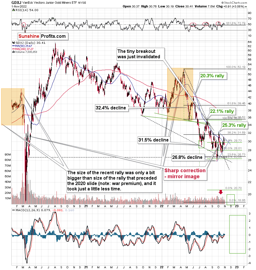 Junior miners moved a bit higher yesterday, but our short positions in them remain profitable nonetheless (and we keep the 100% profitability in the 2022 trades, at least as long as one uses the GDXJ).