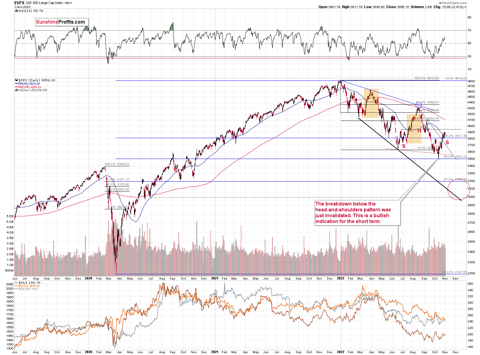 In the case of the S&P 500 index, there is a visible breakout above the declining dashed resistance line based on the August and September 2022 highs.