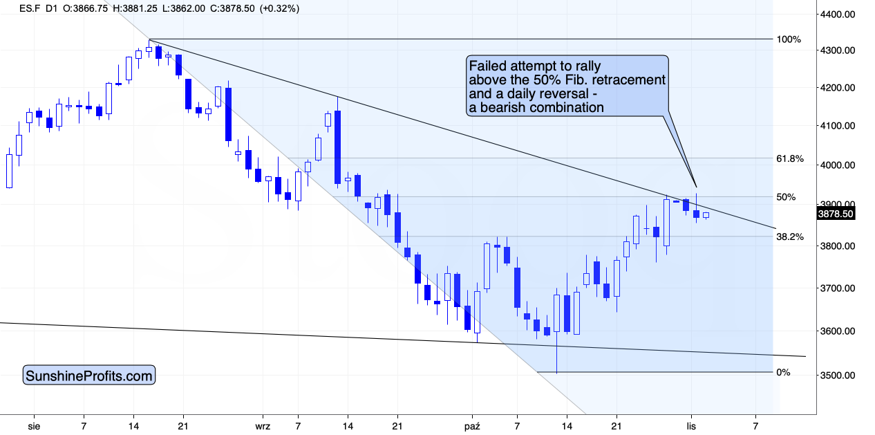 The above chart shows that we just saw a failed attempt to break above the declining resistance line, the October highs, and the 50% Fibonacci retracement based on the August-October decline. This is a powerfully bearish combination.