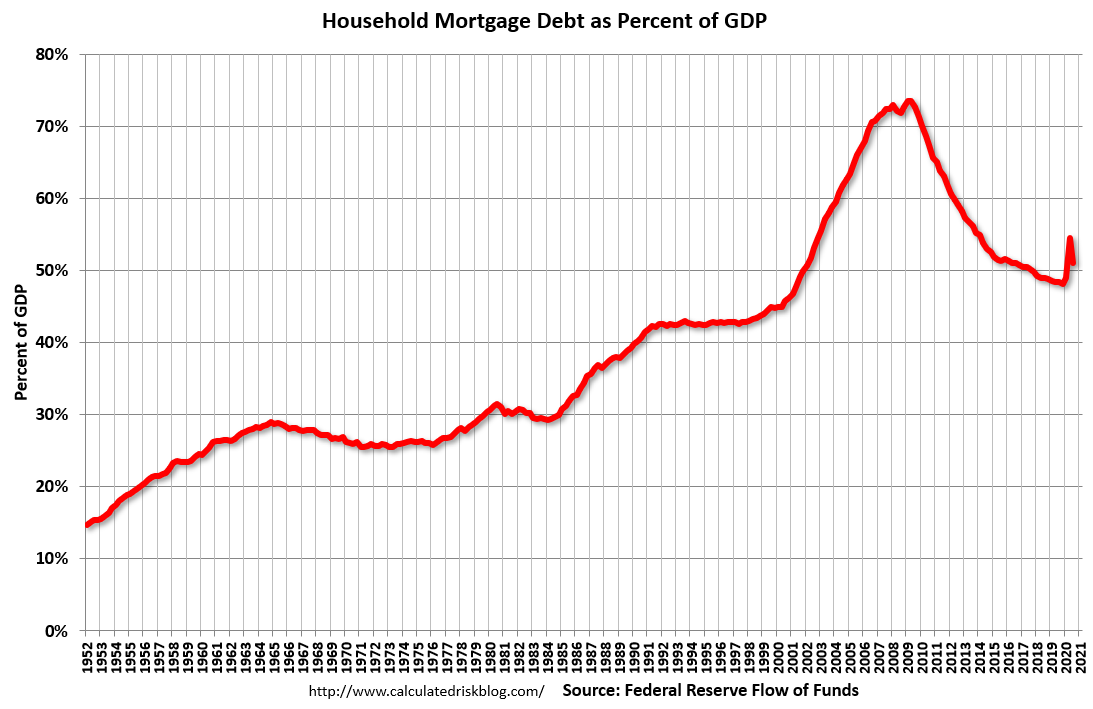 The blip up in Q2 2020 was related to the collapse in GDP more than an increase in mortgage debt. With the recent house price increases, some people are worried about a new housing bubble – but mortgage debt isn’t a concern (and lending standards are much better now then during the bubble).