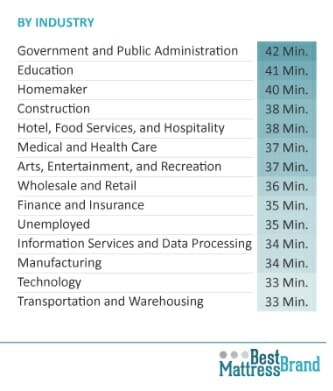 People with more “lightweight” jobs in industries like Arts, Entertainment and Recreation are the ones who stay in bed the most at 14 minutes, while those who stay in bed the least seems to be working in more manual jobs such as Transportation and Warehousing (8 minutes), Homemaker (8 minutes), Construction (7 minutes) and Manufacturing (7 minutes).