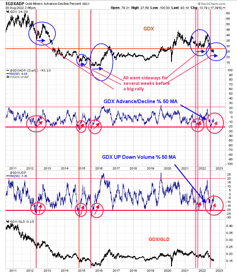 We updated this chart from yesterday. We want to point out that a new decline in GDX never began when the 18-day averages of the up down volume percent and Advance/Decline percent traded below -20. When the -20 reading was recorded on both indicators, the decline was finished and the base-building process begun. This time could be different, but today’s tests of the July low on GDX should find support and in general continue to go sideways, possibly for several more weeks. This type of setup appears to be working out as the previous signals worked out.
