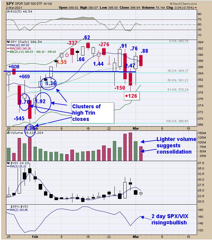The bottom window is the two day average of the SPX/VIX ratio. This ratio helps to define the trend for the SPX. A rising ratio is bullish and a declining ratio bearish, The tick and trin closes the last couple of days have neutral readings and not giving much information. The volume has dropped off the last couple of day and that may be due to Mr. Powell who speaks at a Wall Street Summit on Thursday. Going into events like this market can become quiet. Most likely Powell will speak in market friendly terms. You will know a favorable outcome for the market will come to pass if the TRIN starts to exceed 1.30 during or after his speak.