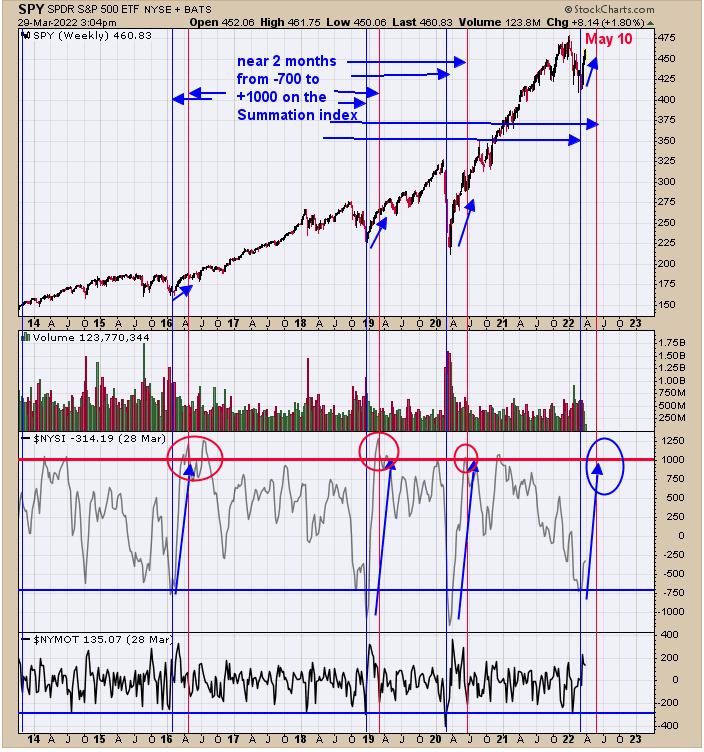 We updated this chart from yesterday, when we said, “The bottom window in the chart above is the NYSE McClellan Oscillator. Bullish intermediate signs are triggered when the Oscillator falls below -300, then rallies above +200. On January 27, the Oscillator fell to -304 and rallied to +230 on March 19. This “Sign of Strength” is an intermediate-term bullish sign. Page two shows the weekly chart of the NYSE Summation index, which also suggests a bullish intermediate rise.” Added to the above, on March 28, the Oscillator closed at plus +135; with today’s near 4/1 Advance/ Decline, the Oscillator will be above yesterday’s reading and well above “0” and bullish. The current rally could last into May 10 (see page 2).