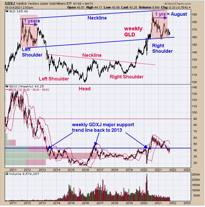 The top window is the weekly GLD (ETF for Gold) going back to mid-2010. The low in 2016 marked the head of a smaller Head-and-shoulders bottom, the neckline of which was broken in mid-2019 and rallied to a high in August of 2020. Since August of 2020, GLD looks to be forming a “Right Shoulder” of a bigger head-and-shoulders bottom (noted in blue lettering).  Its common for the “Left Shoulder” to rhyme with the right shoulder in time and price and it looks as though it about time for the right shoulder to start moving higher to match the rhyme with the left. The neckline of the large head-and-shoulders bottom comes in near 200, which is where a “Sign of Strength” should develop, as that is what is needed to break the neckline. This potential head-and-shoulders bottom pattern has an upside target to 400 (distance from Head to Neckline and add that to the Neckline which equal near 400). It would appear the waiting for this large pattern to play out will be worth the time.