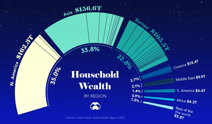 Surprisingly, the regions of Africa, South America, Oceania, and the Middle East combine only for about 11% of the world’s total household wealth.