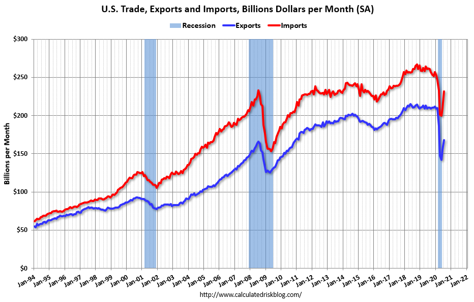 Both imports and exports decreased sharply due to COVID-19, and have now bounced back (imports more than exports),