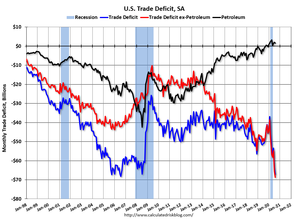 U.S. Trade Deficit The blue line is the total deficit, and the black line is the petroleum deficit, and the red line is the trade deficit ex-petroleum products.